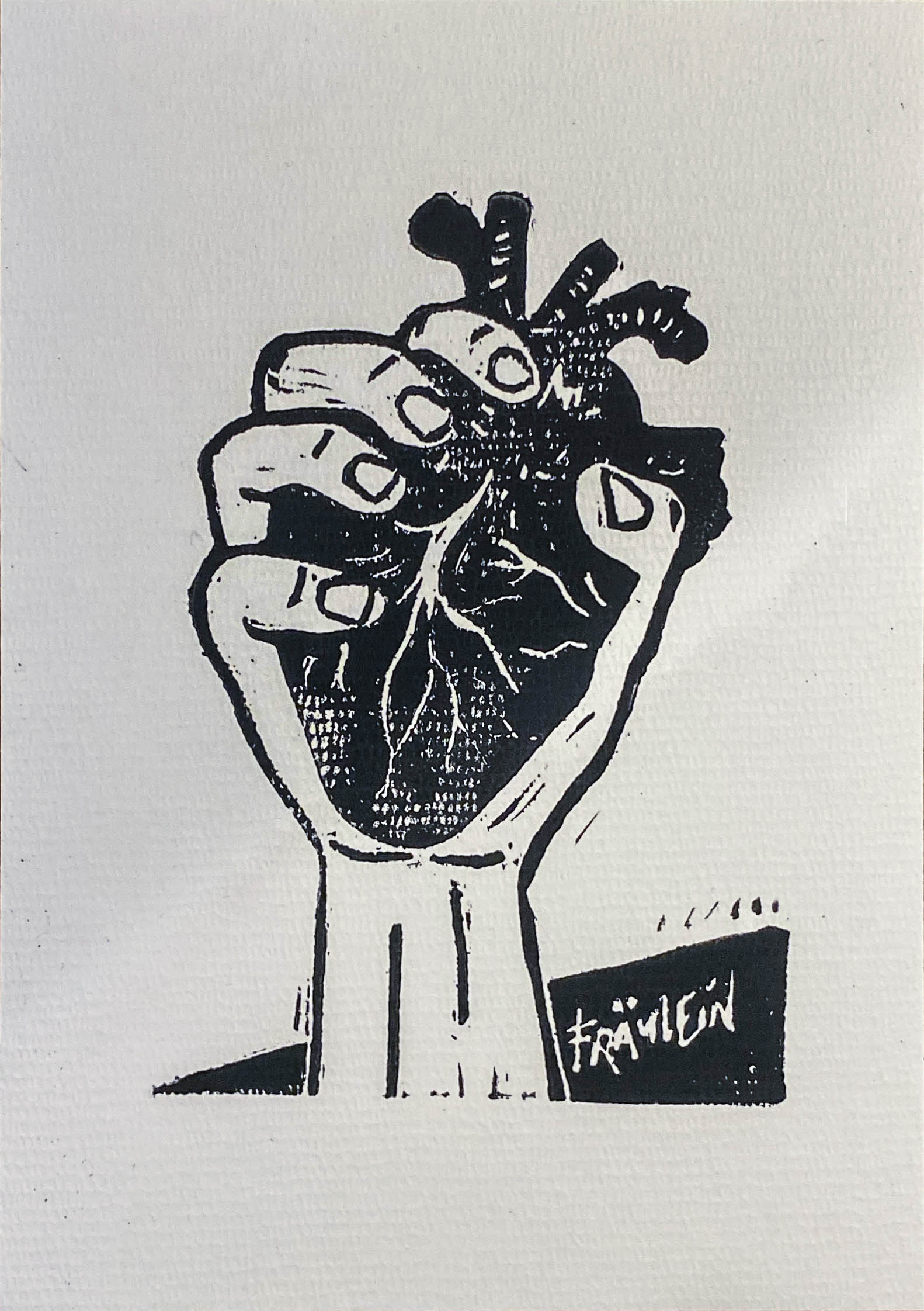 Tryk med motiv fra debutpladen: hjerte i hånd.